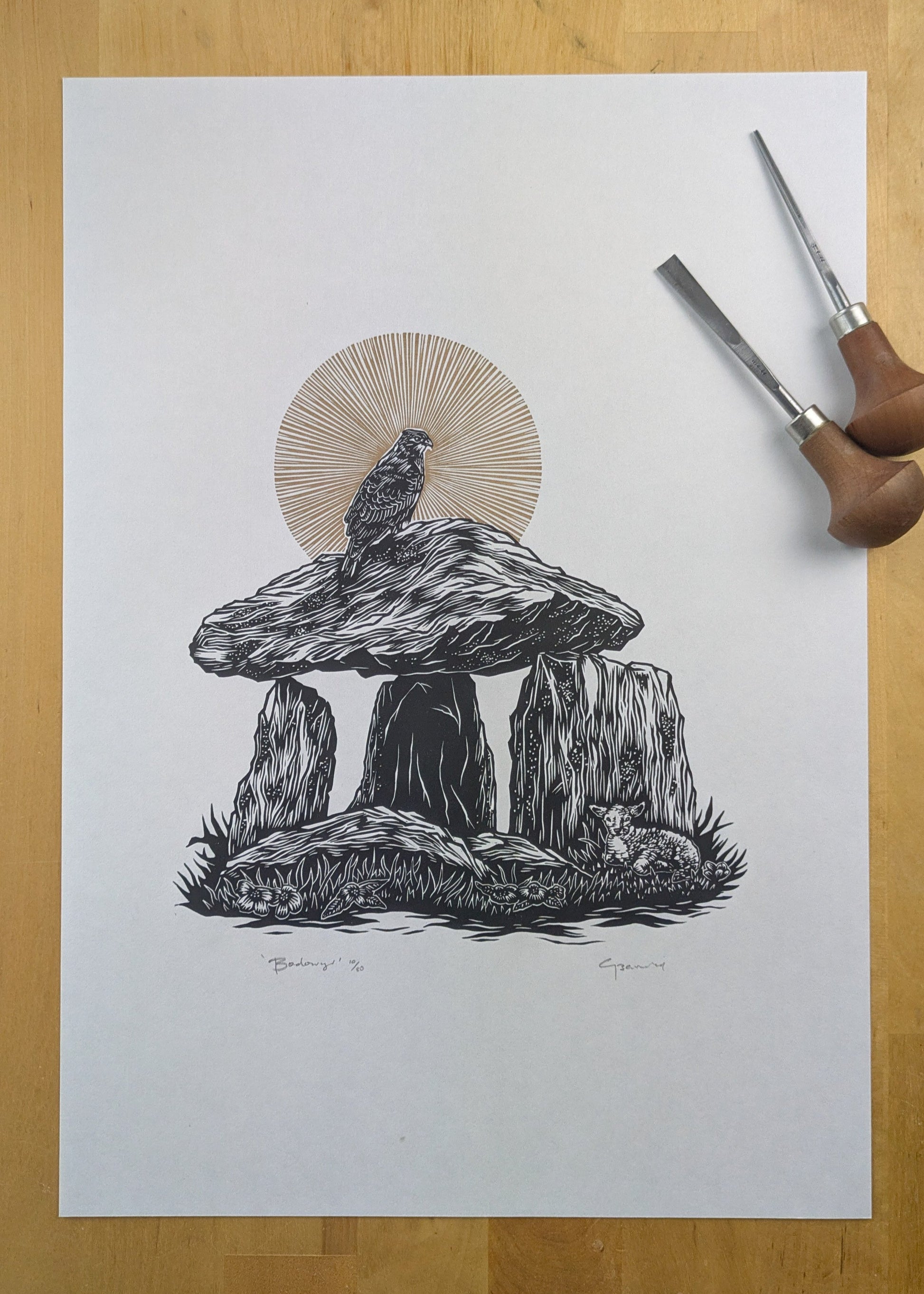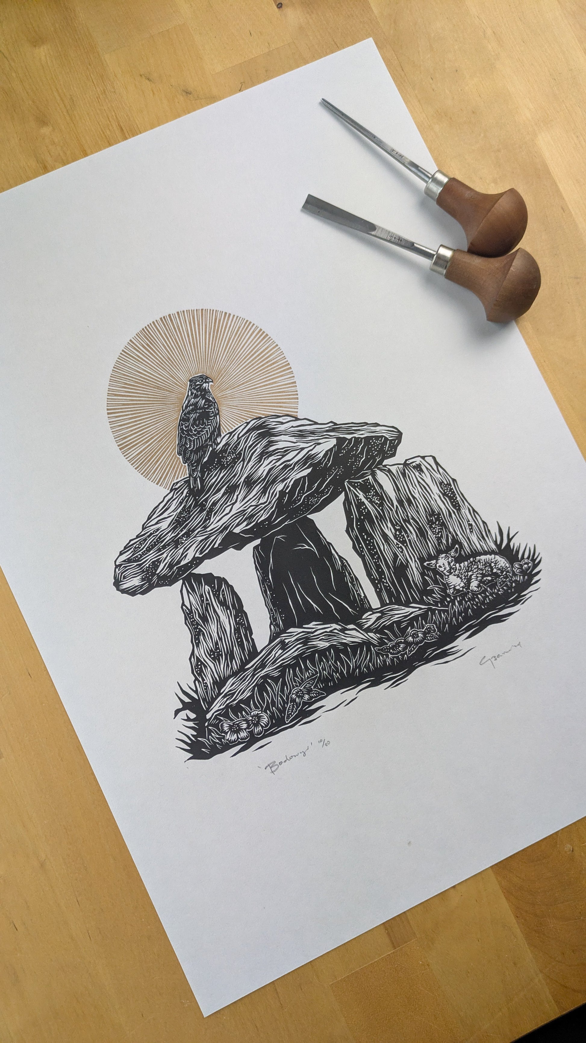 This print was inspired by a trip to Anglesey in Wales, where I was hunting down some of the many ancient sites there. The stone structure in the print is the Bodowyr burial chamber or dolmen, which is a fascinating site. As I walked towards it a buzzard flew and landed on top of the tomb's capstone- a pretty amazing thing to see! I also included a lamb as I was visiting a Bronze Age standing stone and there was a very cute cluster of lambs running around it, so I thought it would be fitting to add one of those to the print. This print is in black with gold sun rays.