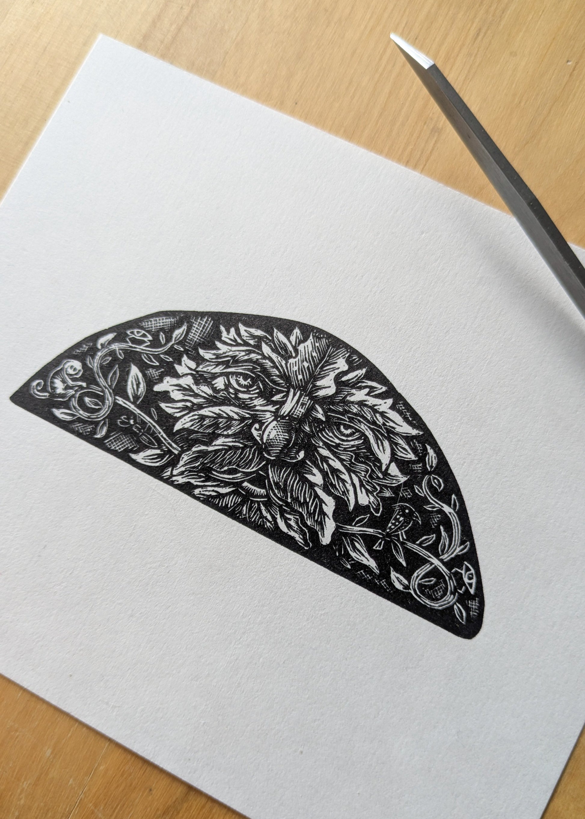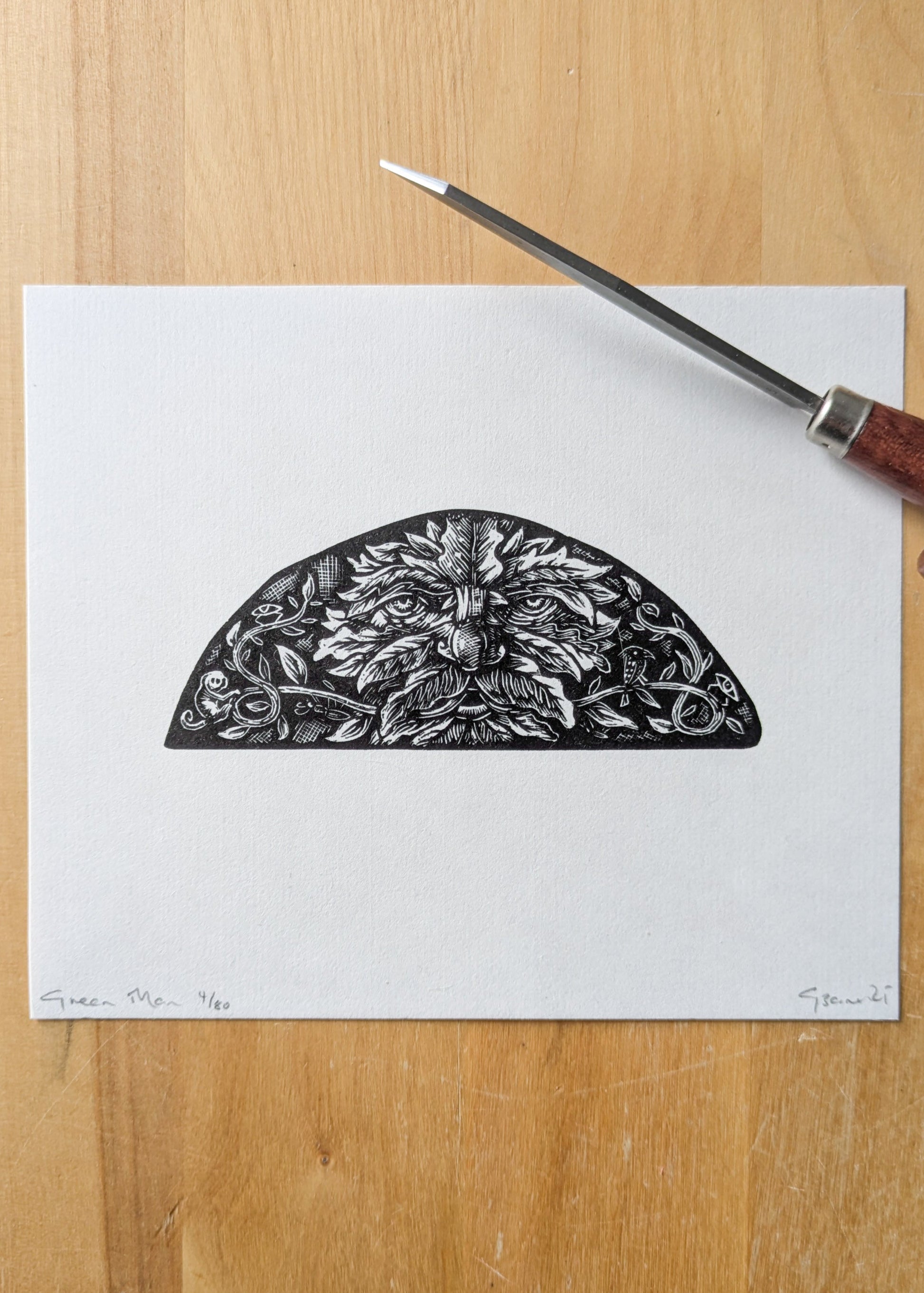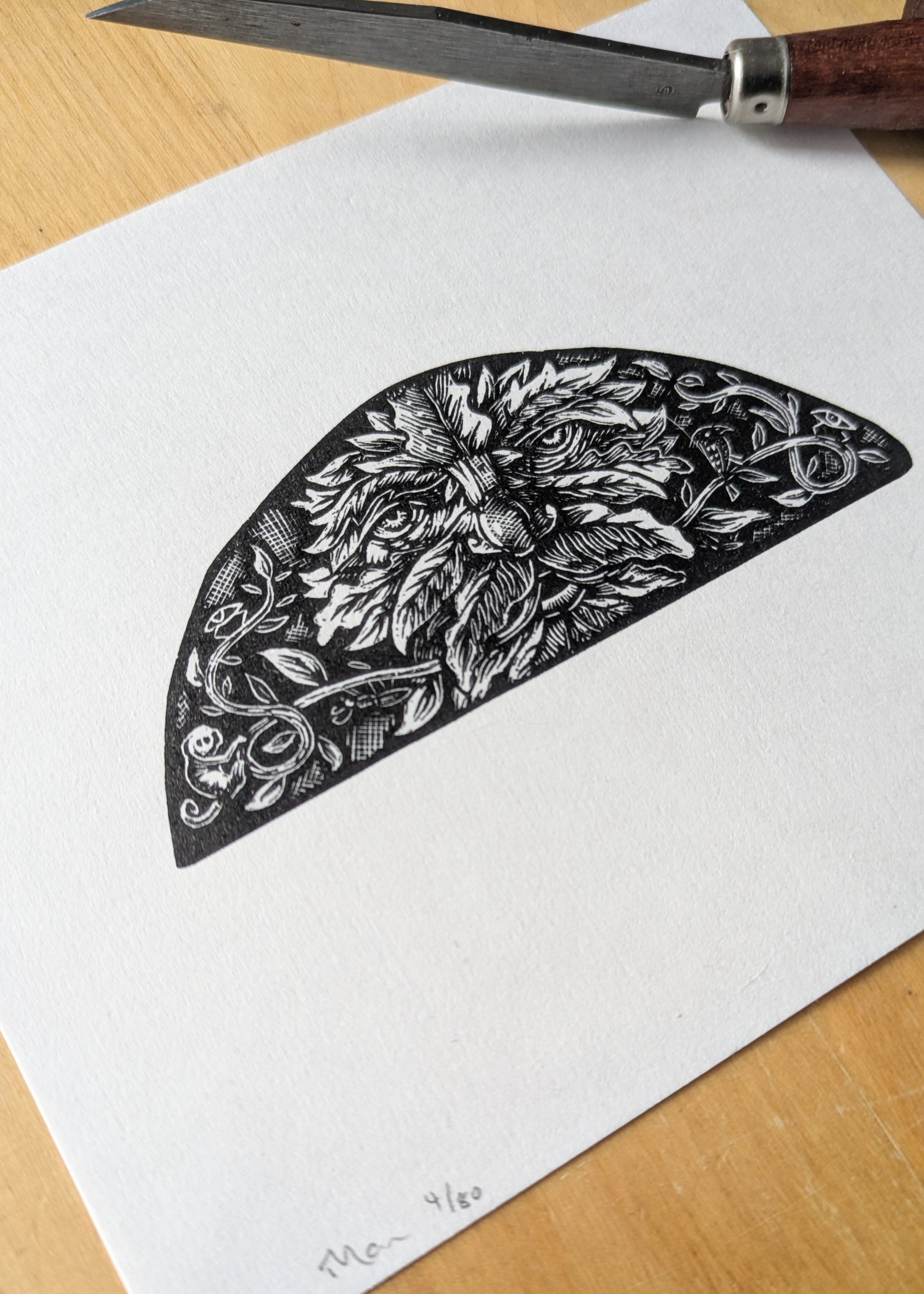 A wood engraving featuring the much celebrated and mysterious green man along with a few other wee characters.