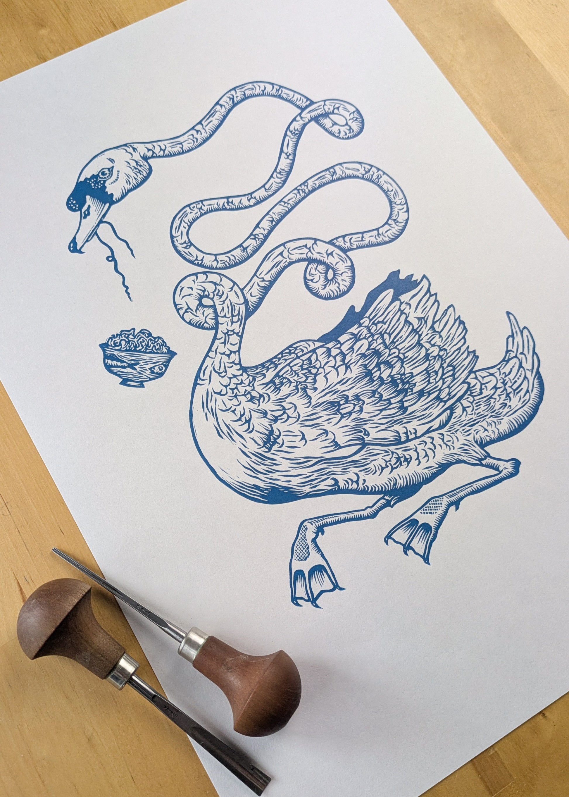 Due to the nature of the printing process there may be small variations from print to print. This is very much one reason why hand printed linocuts are special. Each is unique!