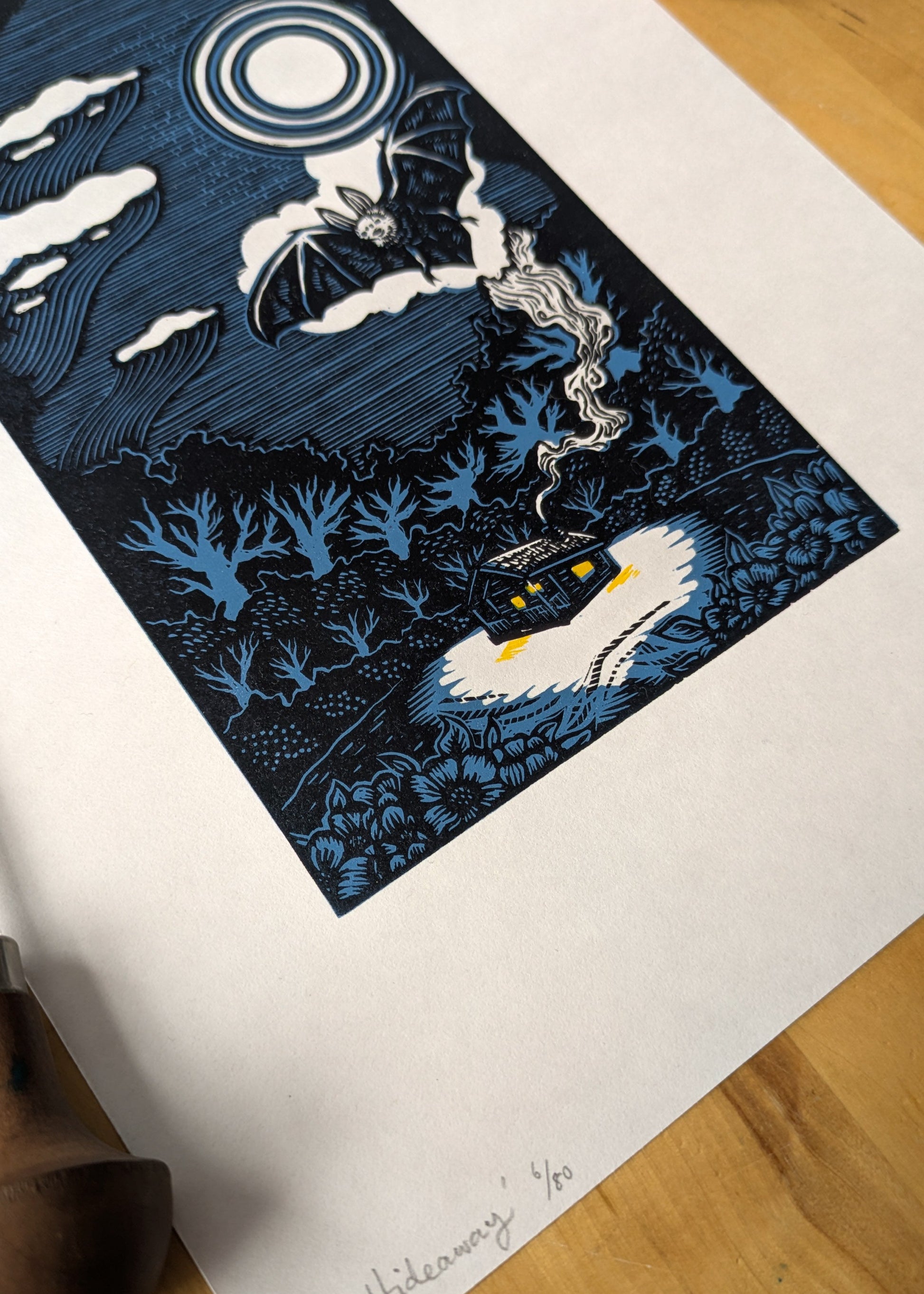 I used two separate lino blocks to create the main image, and finished off the print by hand painting the yellow highlights.