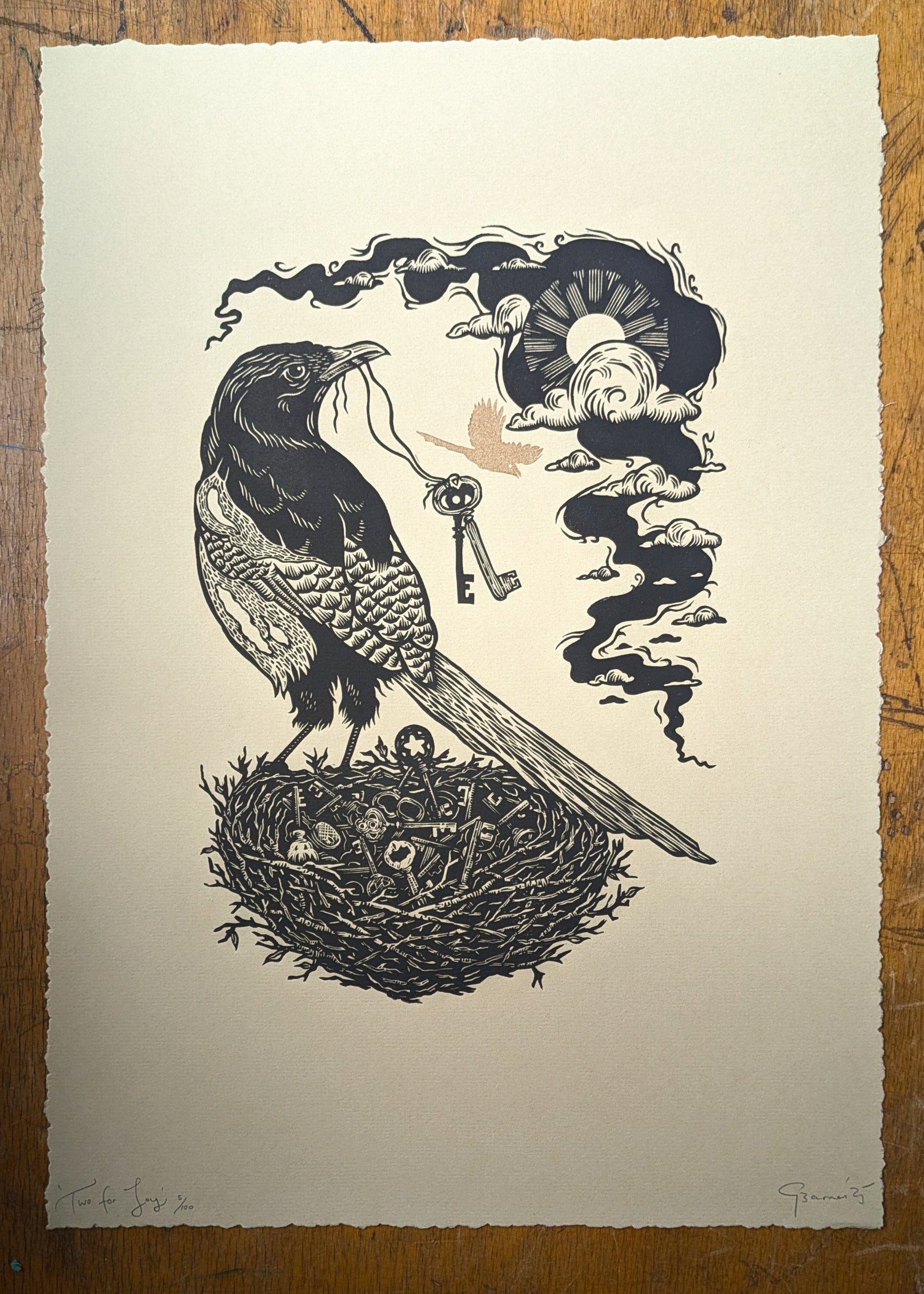A celebration of the super intelligent and crafty magpie. The main design is in black with the second magpie in a lovely bronze-gold.